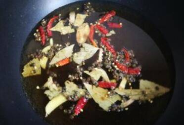 3、把豆腐串放在锅中,加足水,放酱油、盐、糖、辣椒、大料、十三香。