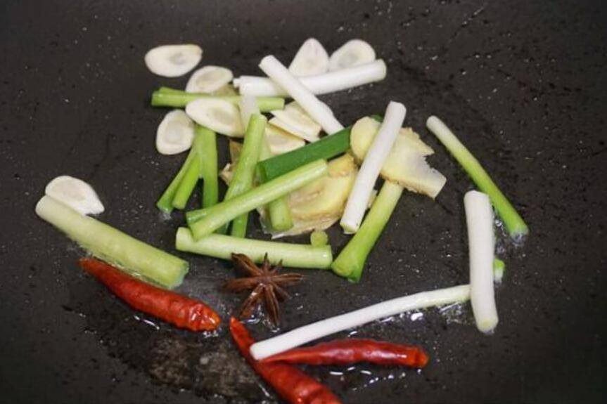 7、坐热锅子,少许油,放入葱白姜片蒜片爆香。
