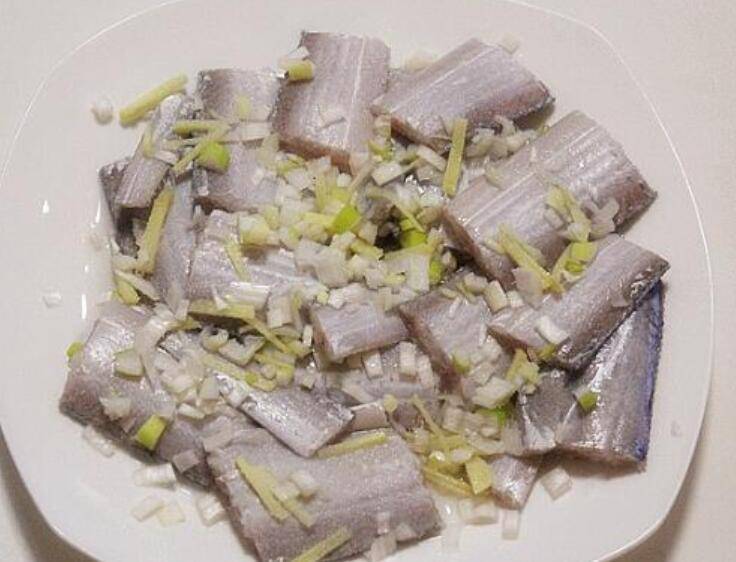 2、腌制。将姜末、葱末、料酒、盐放入带鱼段中拌匀,腌制半个小时左右。