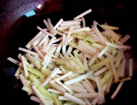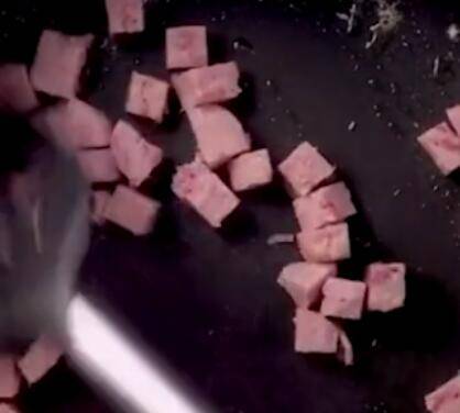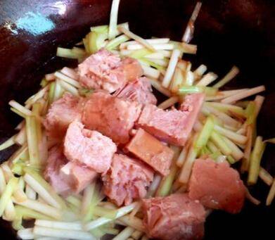 3、锅中热油倒入午餐肉罐头炒至微黄。