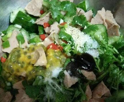 4、全部食材放盆里,放百香果、盐、蚝油、白醋拌匀即可。
