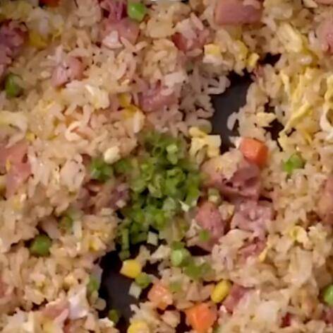 4、倒入果蔬粒米饭翻炒均匀,倒入生抽翻炒上色。