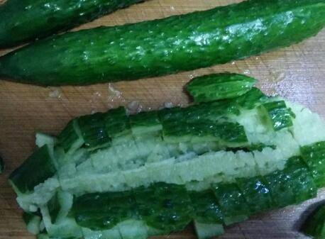 2、午餐肉用勺子挖出来,黄瓜切段。