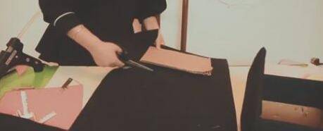 3、在小屋上涂一层热熔胶,用黑色的瓦楞纸粘贴包裹,两片长方形屋顶也同样用瓦楞纸包裹。