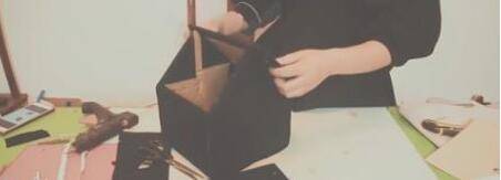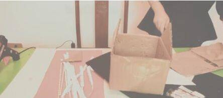 2、将小纸盒切割做出小屋的形状,再另外用瓦楞纸剪出两片长方形做屋顶。