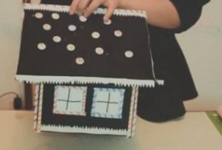 5、屋顶粘上一根纸吸管,屋子边缘粘贴上花边装饰,屋顶随意地粘上彩色的纽扣,房子的侧边用不织布剪了个小狗和小屋子做装饰。