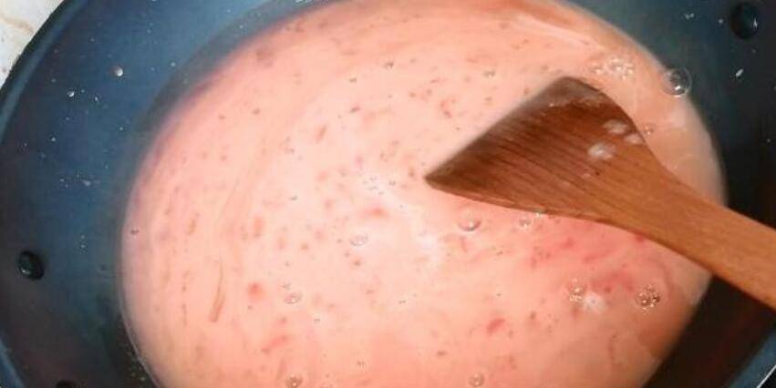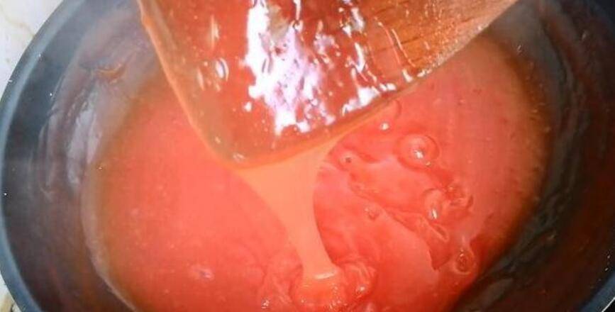 4、锅中倒入450毫升清水烧开,锅中水烧开后,将西瓜淀粉水慢慢倒入锅中,边倒边搅拌。