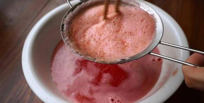 2、打好的西瓜汁用细漏勺过滤一遍,这样口感会更加细腻,总共是450毫升西瓜汁。