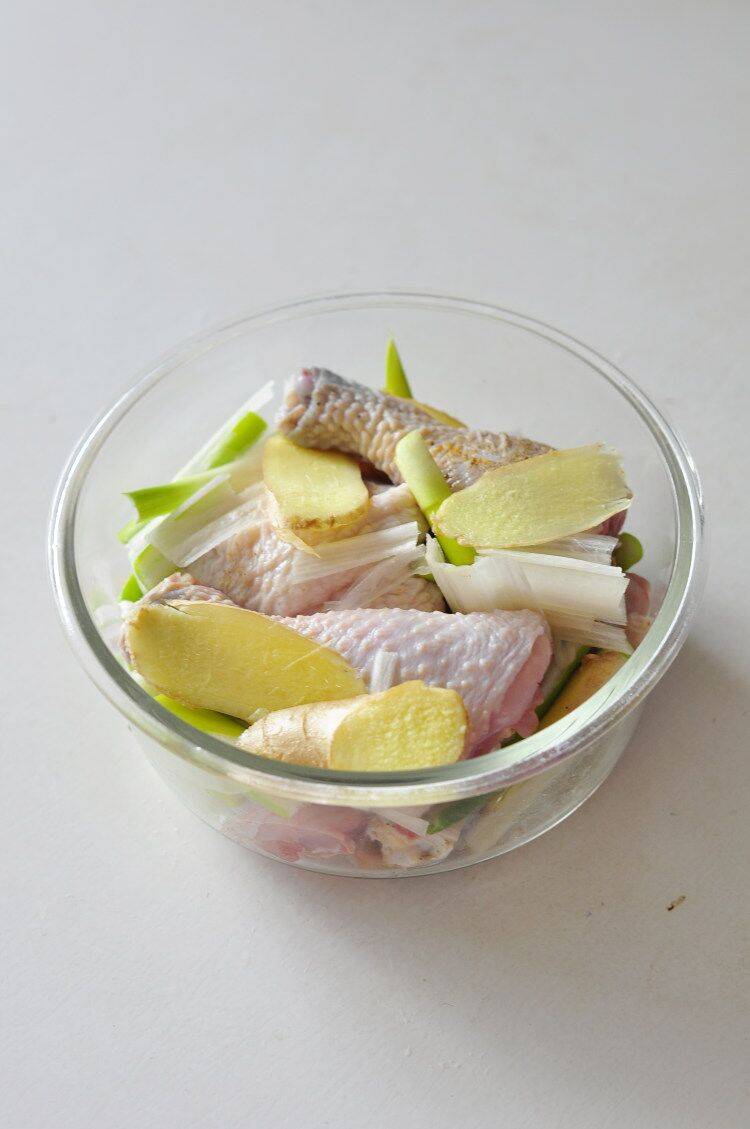 2、鸡腿一切2,用葱段,姜片,盐1茶匙,咖喱粉辣椒粉各1茶匙腌制2小时。