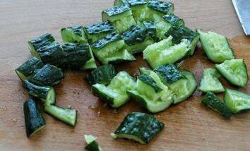 1、黄瓜洗净,用刀拍扁,再切块。香菜择洗干净切小段。蒜捣碎。