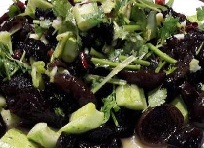 2、将猪嘴蘑、黄瓜块、香菜段、蒜碎混合,加入辣椒油、白糖、米醋、盐和香油拌匀即可。