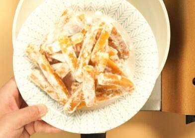 1、南瓜去皮去瓤,切条,焯水1分钟捞出,加入淀粉搅拌均匀。