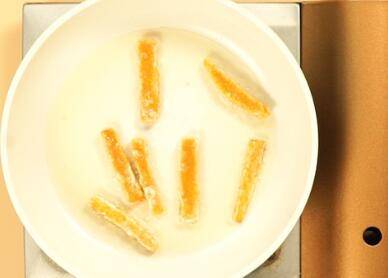 2、锅中放入食用油,油热放入拌好的南瓜条,煎至金黄,捞出。