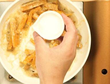 4、放入南瓜条,翻炒均匀,出锅前撒白糖,翻炒均匀即可。