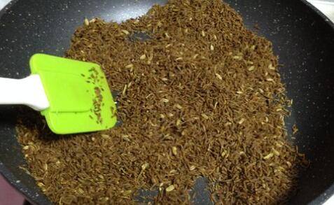 2、锅里不加油,小火倒入孜然茴香粒开始翻炒,慢慢炒至微微发黄发出香味关火。