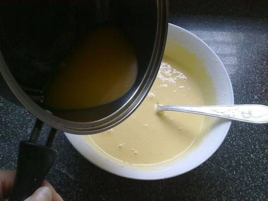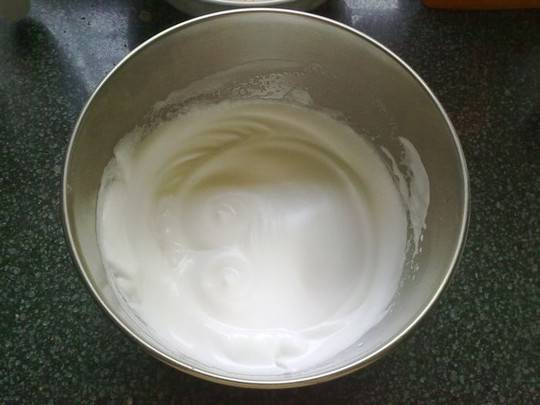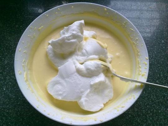 6、蛋白分两次与蛋黄糊混合,上下翻拌均匀。