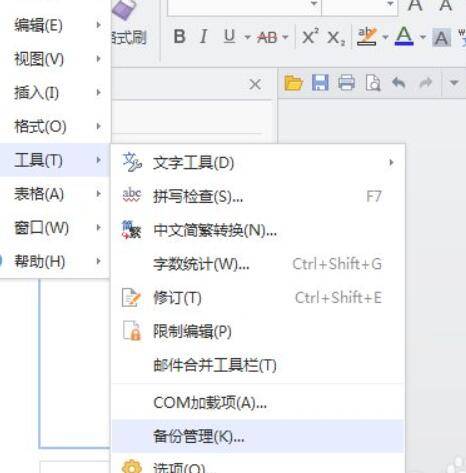点击菜单中的工具—备份管理,在wps界面右边会弹出备份管理界面,即可对备份文件进行操作。