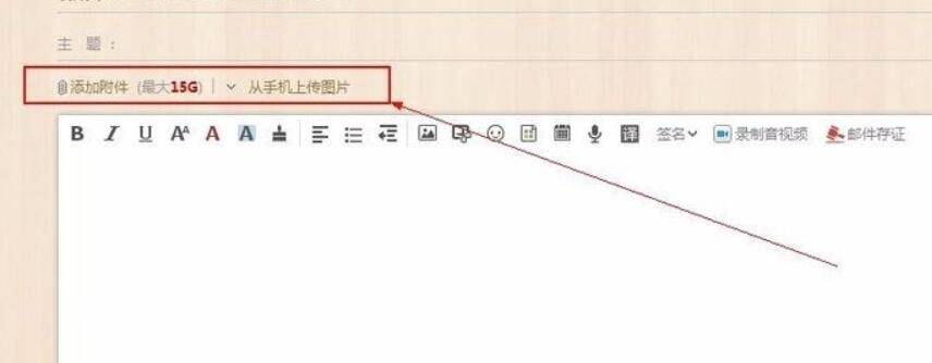 填写好对方邮件帐号、邮件主题等信息后,点击添加附件字样。