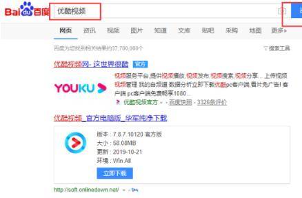 打开一个浏览器,在百度中输入“优酷视频”,单击“百度一下”按钮。