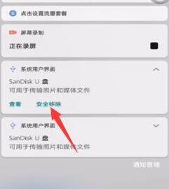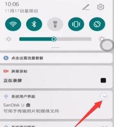 4、下拉通知栏,点击U盘旁边的倒三角。