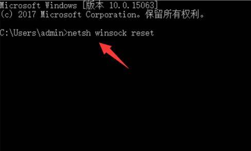6、然后输入 netsh winsock reset 回车,完成以上操作后重启电脑。