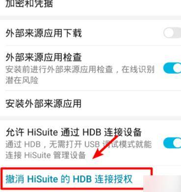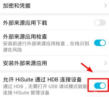 6、同时可以在更多安全设置界面,将允许Hisuite通过HDB连接设备后方的开关关闭,来关闭该功能。