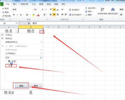 3、进入后点击设置了筛选功能单元格旁边的下拉筛选按钮,选择筛选内容然后点击下面的确定按钮即可。