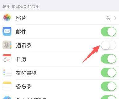 5、在iCloud页面列表中查看一下通讯录是否为开启状态,如果未打开的话,请将iCloud通讯录开启一下,这样Apple ID账号上面的通讯录就会自动恢复至iPhone手机里面。