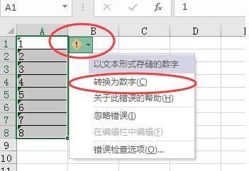 3、点击选中单元格右上角的黄色感叹号,在弹出的选项中点击“转换为数字”。
