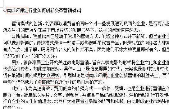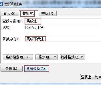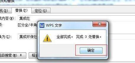 在弹出的窗口中,选择“替换”功能,在“查找内容”中输入集成灶,在“替换为”中输入集成环保灶,然后点击“全部替换”,会弹出一个小窗口。