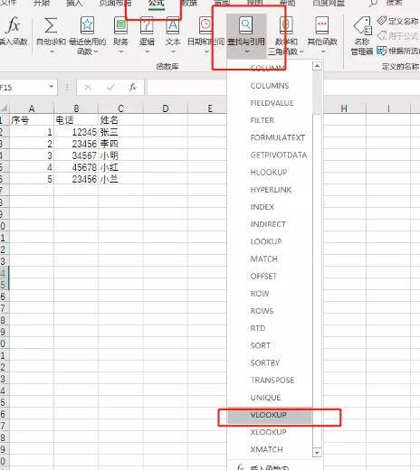 3、点击上方的公式选项,然后点击二级菜单中的查找与引用选项,最后点击下拉菜单中的VLOOKUP选项。