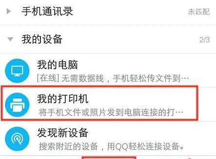 2、进入手机QQ中点击“联系人”,“我的设备”,“我的打印机”。