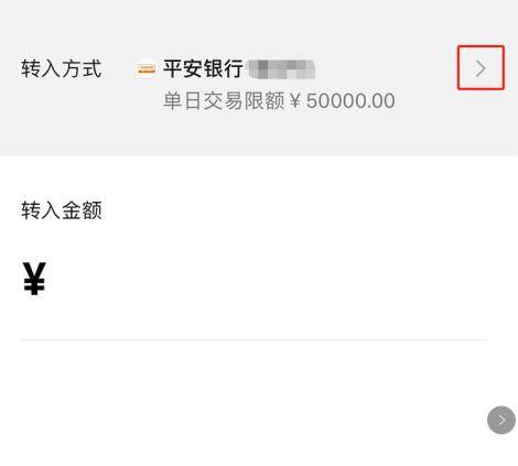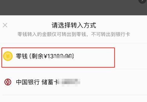 5、进入转入页面后,点击上方转入方式右侧的>图标,然后点击下方弹出窗口中的零钱选项。
