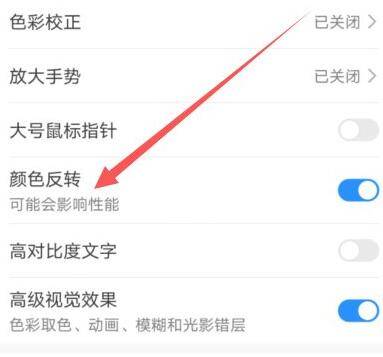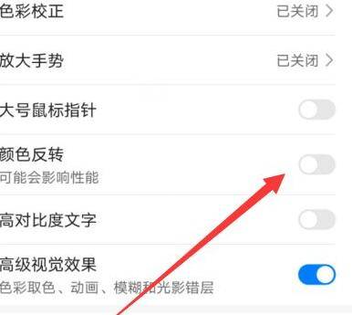 5、在这个界面选择关闭颜色反转。