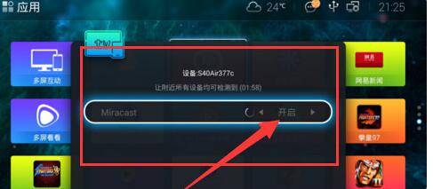进入Miracast界面显示“开启”之后,使用遥控器点击“确认”按键,点击开启电视的Wi-FiDisplay功能。