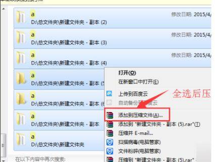 搜索完成后全选要删除的a文件夹右键选择指定压缩文件,最后再按上面的高级解压选不解压路径即可。