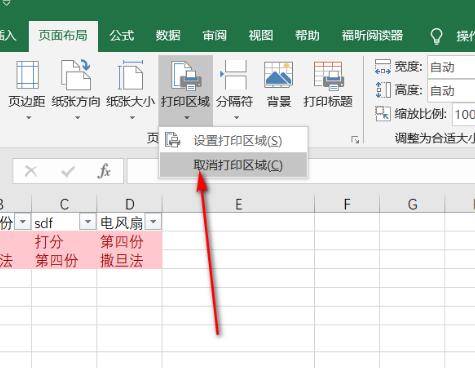 4、在弹出的下拉菜单中点击取消打印区域按钮。
