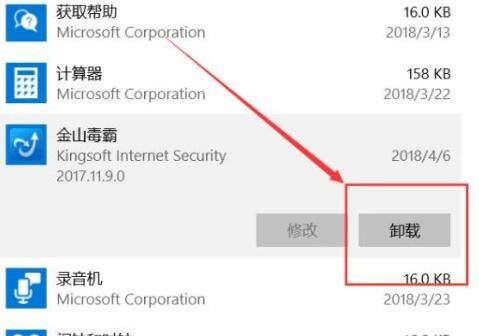 3、在打开的应用列表中,找到安装的金山毒霸软件,并点击“卸载”按钮。
