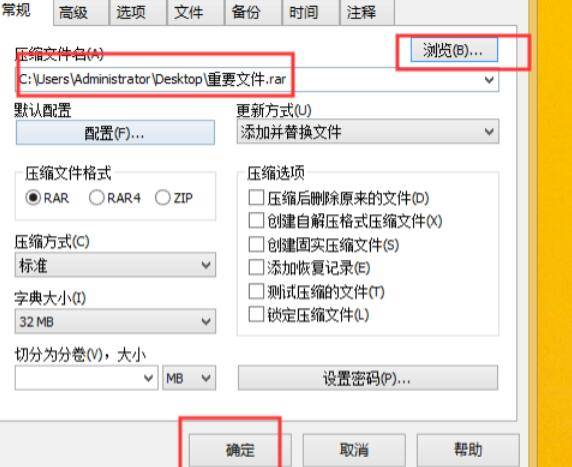 3、在出现的压缩文件名和参数中输入压缩文件的名称后,点击浏览按钮选择该压缩文件的保存位置后点击确定按钮。