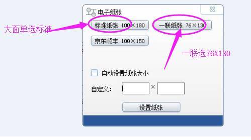 选择需要设置的纸张大小。菜鸟一般是100X180;百世一联是76X130。设置好后点击“设置纸张”即可。