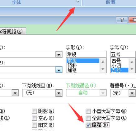 将鼠标放在倒数第二页的最后行,点击顶部菜单栏字体选项右下角,效果选择隐藏,点击确定。