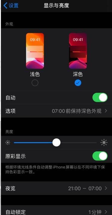2、进去后,可以看到浅色和深色,点击浅色即可关闭黑色背景,并且可以设定相应的开关时间。