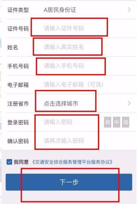 3、点击注册跳转如下页面,按要求输入身份证号码、姓名、手机号码、选择城市、输入密码,然后点击“下一步”注册成功。