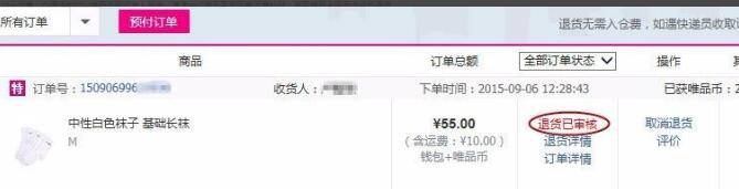 4、自助退货申请成功后相关专业人员会在一小时内审核通过,查看状态为“退货已审核”即可将商品回寄唯品会办理退货(此时唯品会也会给会员下发短信和站内消息)。