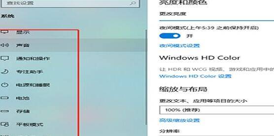 2、在显示设置的主界面,左侧的一栏就是显示设置的主菜单,主要有显示、声音、电池、电源和睡眠等菜单。