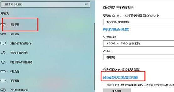 3、在左侧的菜单中,点击“显示”,在右侧边展开了显示的设置属性,往下拉,找到“连接到无线显示器”。