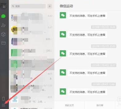 演示机型:华为MateBook X 系统版本:win10 20H2 APP版本:电脑版微信3.2.11、打开并登录自己的电脑版微信客户端,登录成功后显示聊天页面,点击左下角的三条横线菜单按钮。