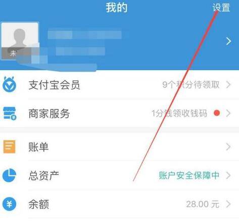 2、在支付宝“我的”页面中点击右上角“设置”。