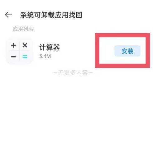 4、在系统可卸载应用找回页面,可以看到有已经被删除的计算器在里面,点击“安装”,即可把计算器安装恢复回手机。