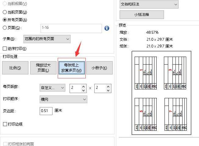 4、在“打印”对话框中的打印处理栏,选择“每张纸放置多页”。